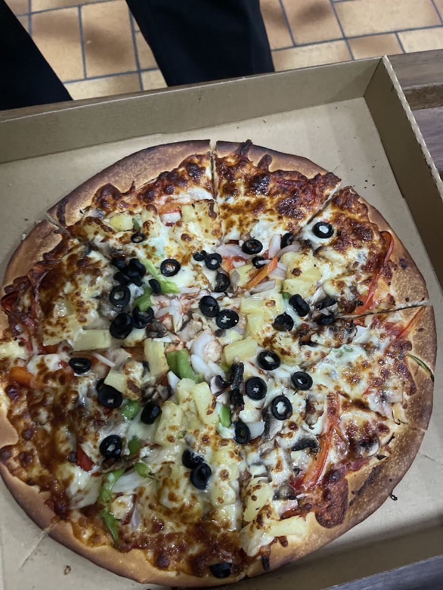 Mushrooms, onion, capsicum, pineapple topped with cheese olives on a tomato base.