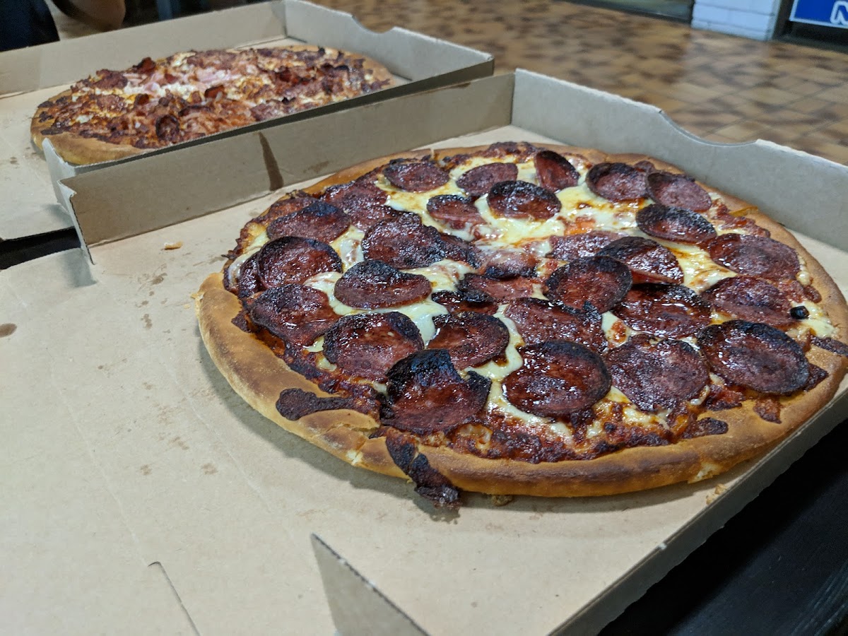 Ham, cabanossi, capsicum, onion, mushrooms topped with olives and cheese on a tomato base.